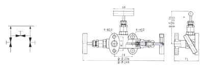 一体化三阀组与1151系列电容差压变送器配套安装,用于从引压点将信号引入1151系列差压力变送器正、负测量室,使引压点与测量室接通或断开。通过法兰与送变器直接连接。